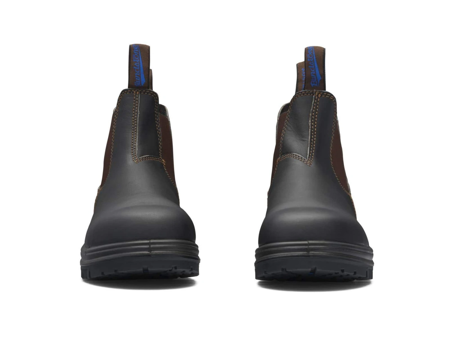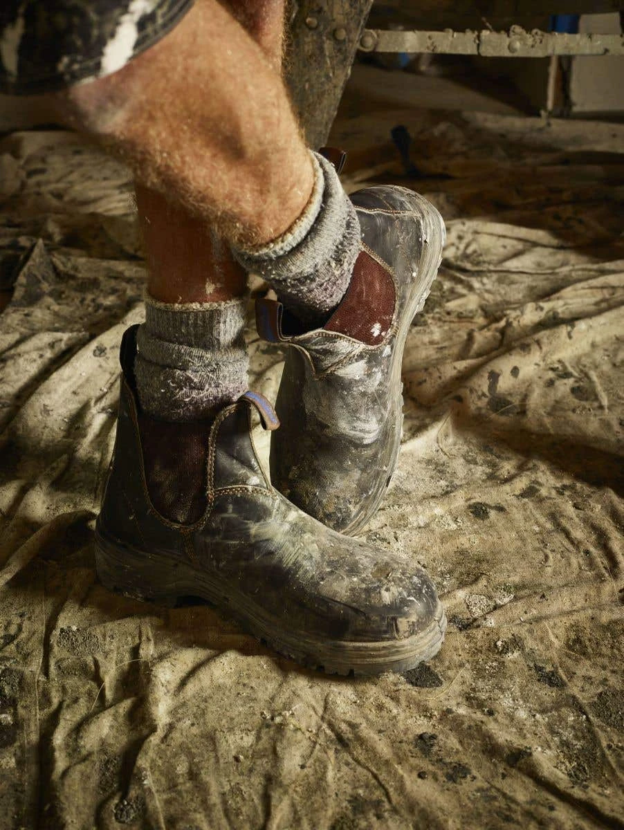 - Stout brown premium water-resistant leather upper, elastic side safety boot.