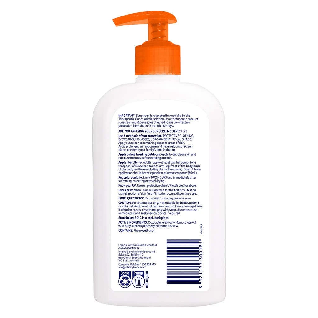 Apply to dry, clean skin and rub in 20 minutes before heading outside. Apply at least one teaspoon (5ml) to the face (including the neck and ears). Use in conjunction with regular body sunscreen to achieve the minimum 35ml full body application. Reapply every two hours and immediately after swimming, sweating or towel drying. Use 5 methods of sun protection – protective clothing, eyewear/sunglasses, a broad-brim hat and shade.