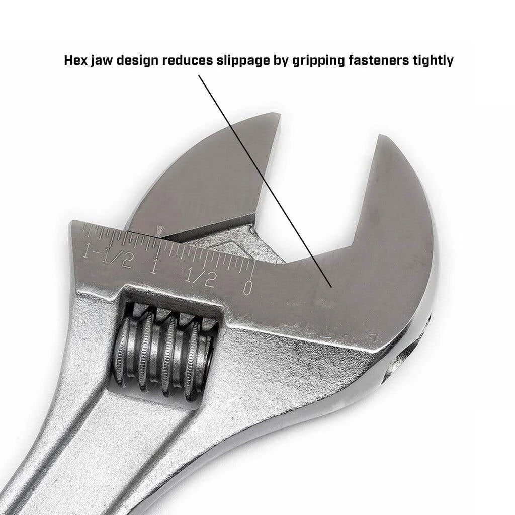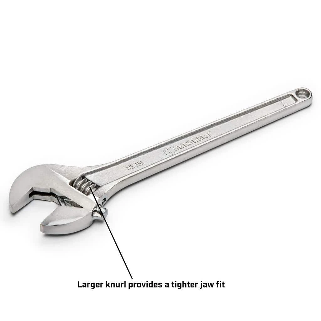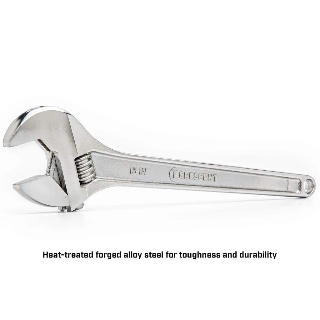 Since the introduction of the original Crescent wrench in the early 1900s, the Crescent brand has become synonymous with adjustable wrenches. Crescent Adjustable Wrenches feature a large knurl for easy adjustment and a tight jaw fit. Large capacity 43mm/1-11/16″ jaw fits a wide range of fastener sizes. Its hex jaw design helps reduce slippage and tightly grips the fastener for solid, secure operation, while the corrosion-resistant chrome finish helps prevent rusting. Heat-treated forged alloy steel for toughness and durability. A wide handle design provides comfort and reduces fatigue during extended use. Ideal for both pros and do-it-yourself enthusiasts.
