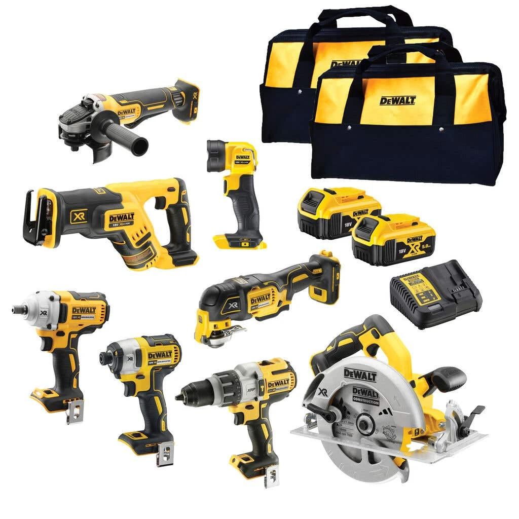 The 18V 5.0Ah XR Combo Kit – 8 Piece includes seven power tools, a flashlight plus an 18V charger, two 18V 5.0AH Li-Ion batteries and two contractor carry cases. The tools and flashlight are powered by brushless motors for convenient cordless use. Easily complete any or trade task with the included XR Brushless 3 Speed Hammer Driver Drill, 3 Speed Brushless Impact Driver, 1/2″ Compact Mid Torque Impact Wrench, Brushless 184mm , XR Brushless Compact Reciprocating Saw, XR Brushless 125mm Paddle Switch Angle Grinder and Brushless 3 Speed Quick Release Multi-Tool. Easily work throughout the day by keeping batteries powered when not in use thanks to the 18V multi-voltage charger which has a wall mountable design, and the two included XR Li-Ion slide batteries which deliver 66% more runtime than a standard 3.0ah battery pack. Easily transport and store everything with the two carry cases.
