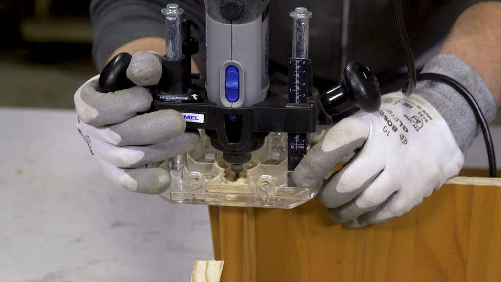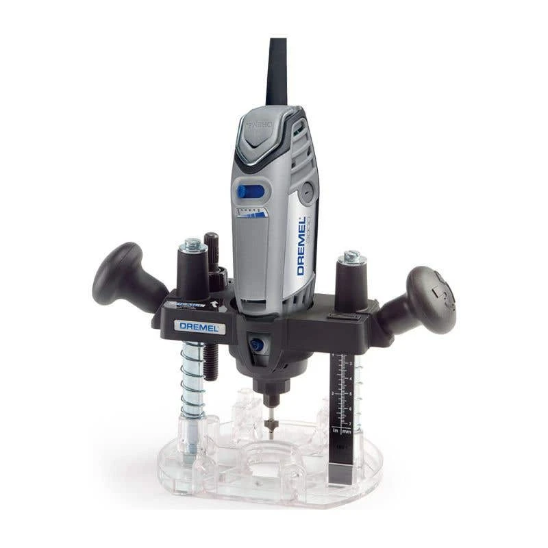 Transform your Dremel Rotary Tool into a lightweight, free to hold . Have full accuracy, stability and control with your Dremel Tool and the attachment for your smaller to medium sized routing projects. When working with materials like wood, gain a quick way to get curved edges, straight slots or have the freedom to start routing in the middle of your workpiece for inlays or keyhole slots. The transparent, plastic base of the attachment ensures a clear view of your project and won’t damage your material. Achieve smooth and consistent cuts thanks to the possibility to lock your routing depth.
