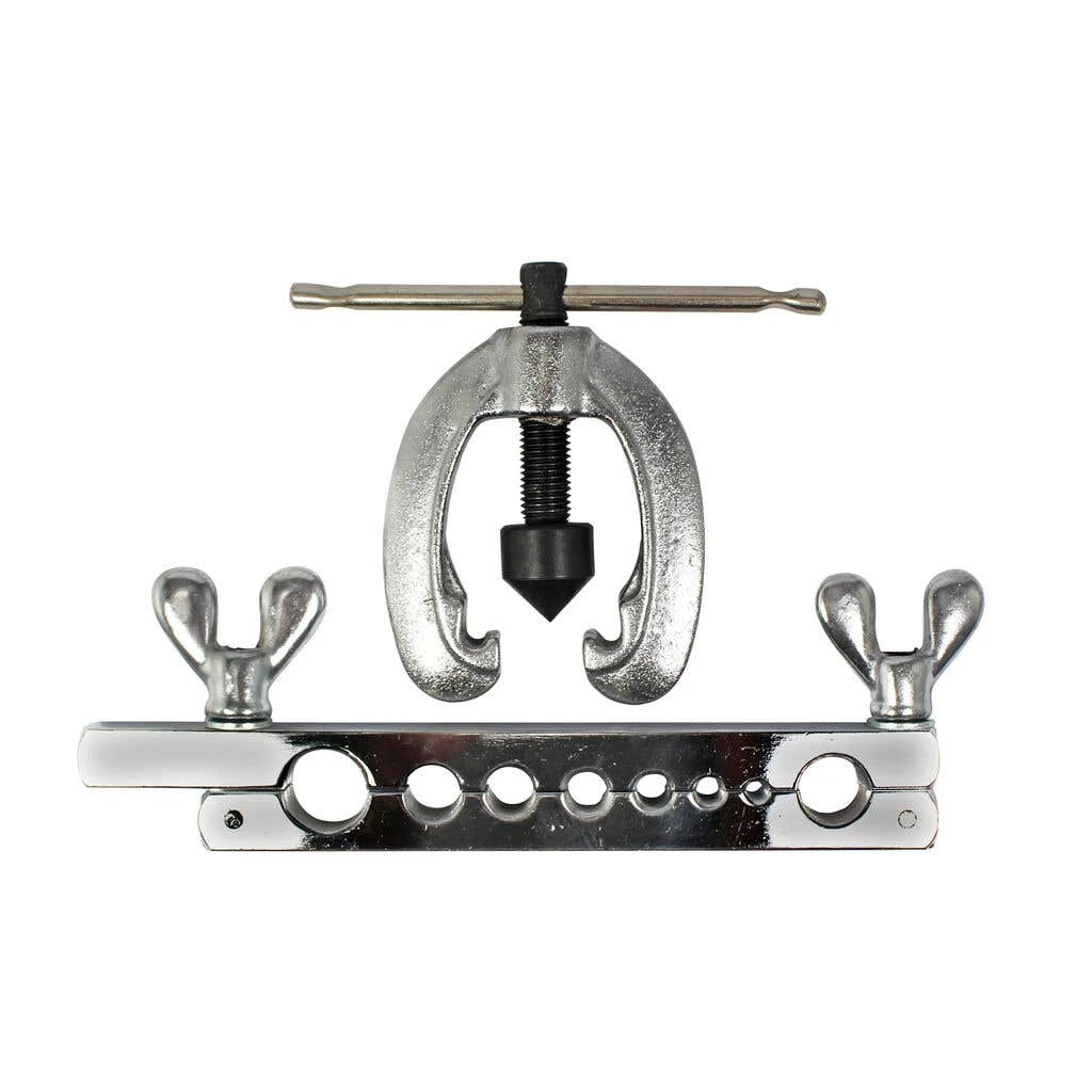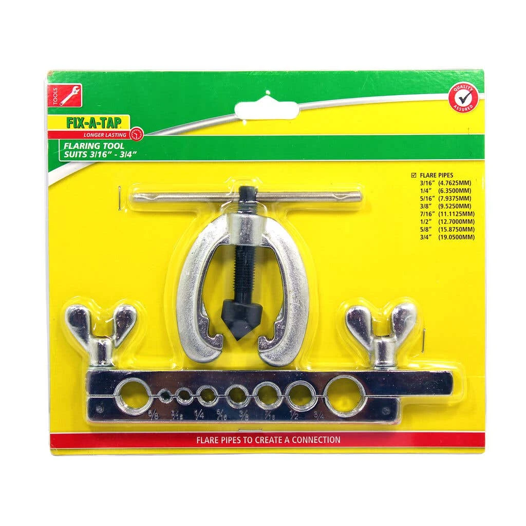 The FIX-A-TAP Flaring Tool Kit is designed to flare pipes to create a connection for rigid, IMC and soft copper tubing. Complete with everything you’ll need to get the job done, including metric and imperial flaring bars and yokes (with 3/16″ β ΒΎ” flaring capacity), protective molded case and spare hoses, this kit has all the tools you need for flared pipe installations of all types. The flaring bar is ideal for use on both rigid, IMC, and soft copper piping from 3/16″ through 1/2″. And it’s professional quality too.