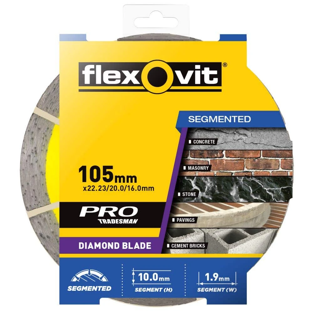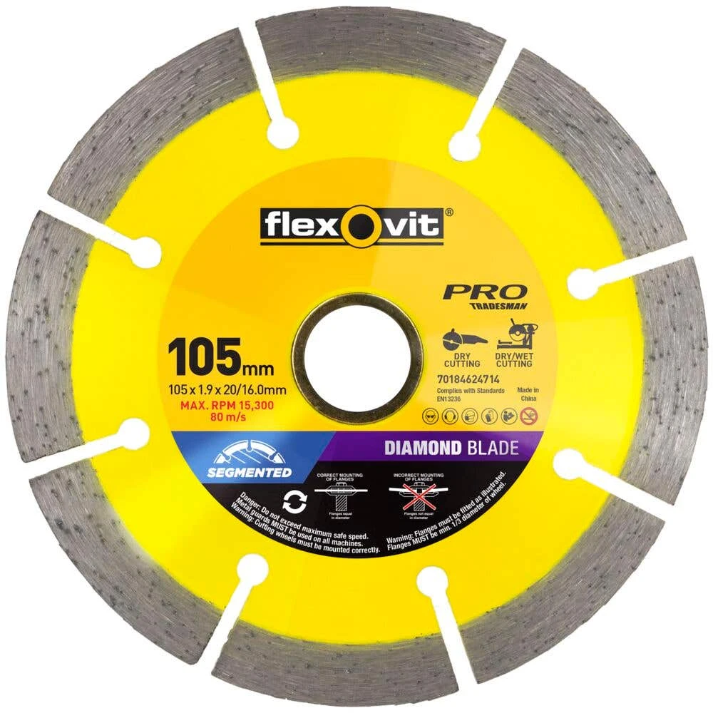 Segmented diamond blades are designed for aggressive, faster cutting. They’re ideal for cutting brick and concrete, but can also be used for other materials like masonry and asphalt. Flexovit Segmented Diamond Blade 105mm is designed for aggressive and large cutting applications. It features higher diamond segments for longer life and gullets to efficiently clear materials. These segments make it ideal for concrete, masonry and brick.