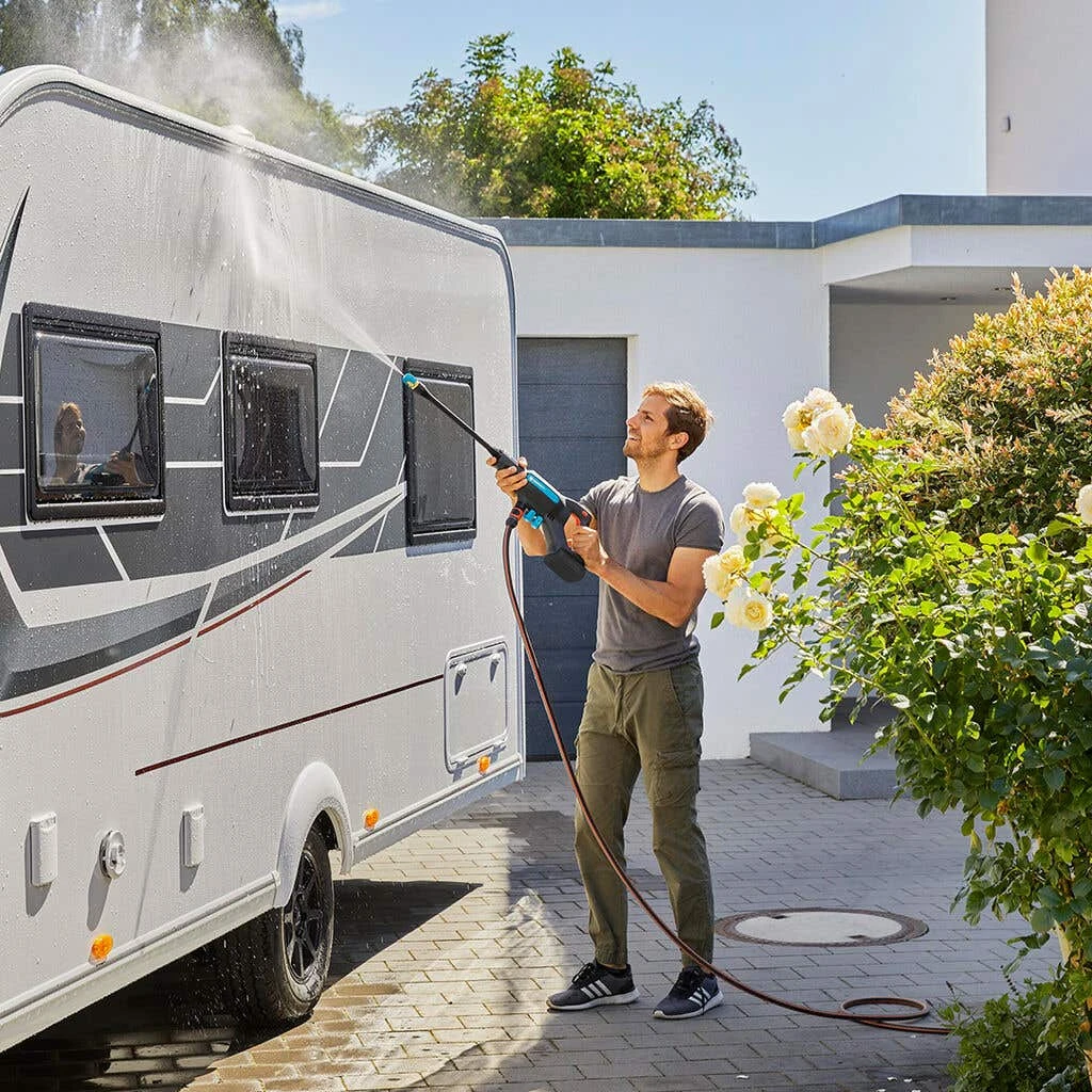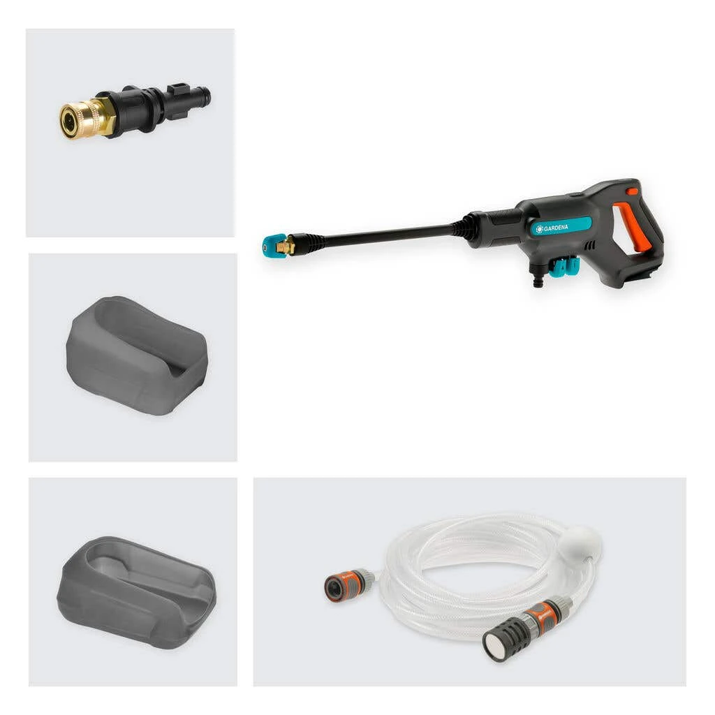 The Gardena Pressure Washer AquaClean 24/18V P4A is one of the most versatile pressure cleaners in its class with its LED battery check display integrated on the cleaner and 3 power settings delivering 9, 14 and 24 bars of pressure. The pressure washer is able to operate for approximately 38, 20 or 16 minutes depending on the operation mode and is compatible with all Gardena 18V POWER FOR ALL ALLIANCE batteries. Pressure can be reduced even further to the 9 bar Soft-Clean mode which is particularly gentle, ideal for delicate material and objects.