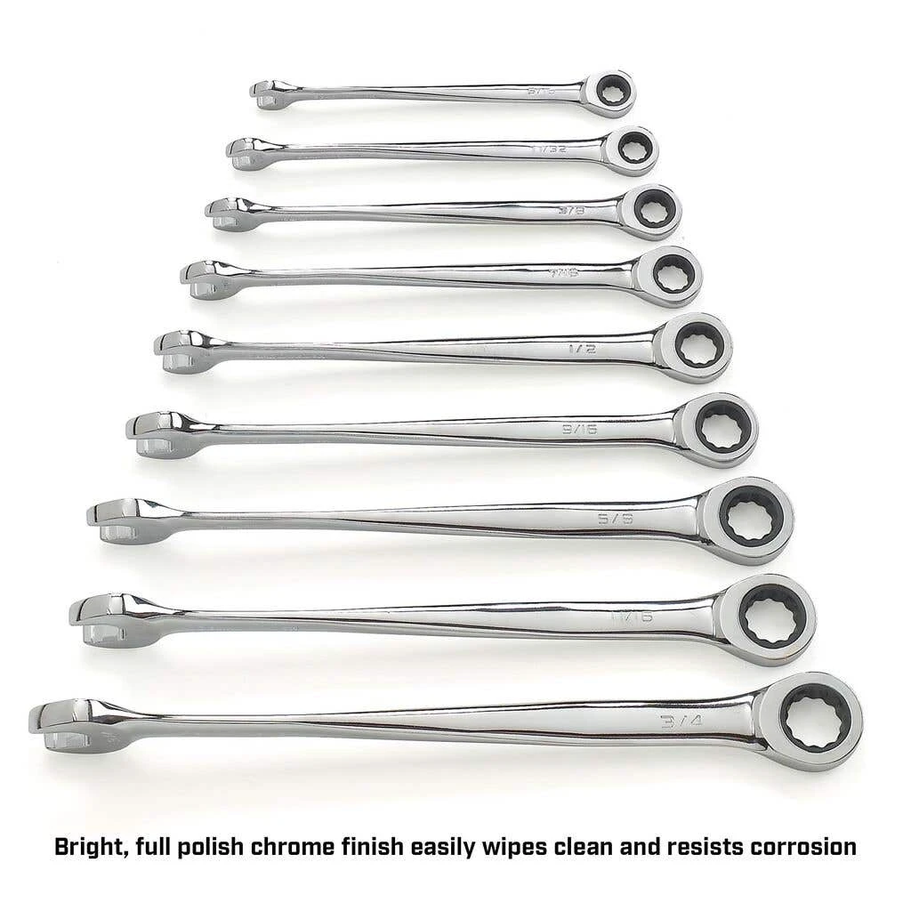 We designed the Gearwrench XL X-Beam™ wrenches to give you up to 500% more area for turning the wrench versus a standard wrench handle. Allows you to apply force to the flat of the wrench, greatly reducing hand fatigue and pain. The wrenches are 20% longer than our standard ratcheting combination wrenches, providing improved access and giving you the leverage to tighten or release the most stubborn fasteners. The box end is designed to move fasteners with as little as 5°of motion, versus the 30° required for standard wrenches. The wrenches have strong alloy steel bodies with a bright, full polish chrome finish. The X-Beam is available in ratcheting combination, reversible ratcheting combination, and flex combination styles.