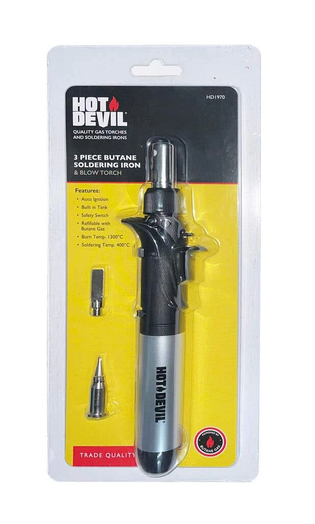 The Hot Devil Torch Blow & Solder Iron Kit is great for a number of uses including electrical soldering, heat shrink packaging, wood burning, foam cutting and engraving. Supplied empty and not recommended to run the torch for more than 10 minutes at a time.