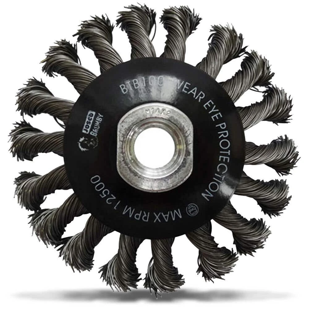 The Josco Twistknot Multi-Thread Bevel Brush 100mm is a medium/heavy application brush wire with HD steel wire material used for aggressive brushing. Removes rust, paint and corrosion and allows for quick and simple fitting of the brush onto all . It can be used on a massive range of surface materials, including steel, brass, iron, plastic and wood. Pairable with M14 Drill Adaptor BDBPA for use in a drill. You will get the best performance out of this twist knot bevel brush by brushing at an angle to the workpiece and only brushing with the tips of the wire. Using excessive pressure will cause the wire to break.