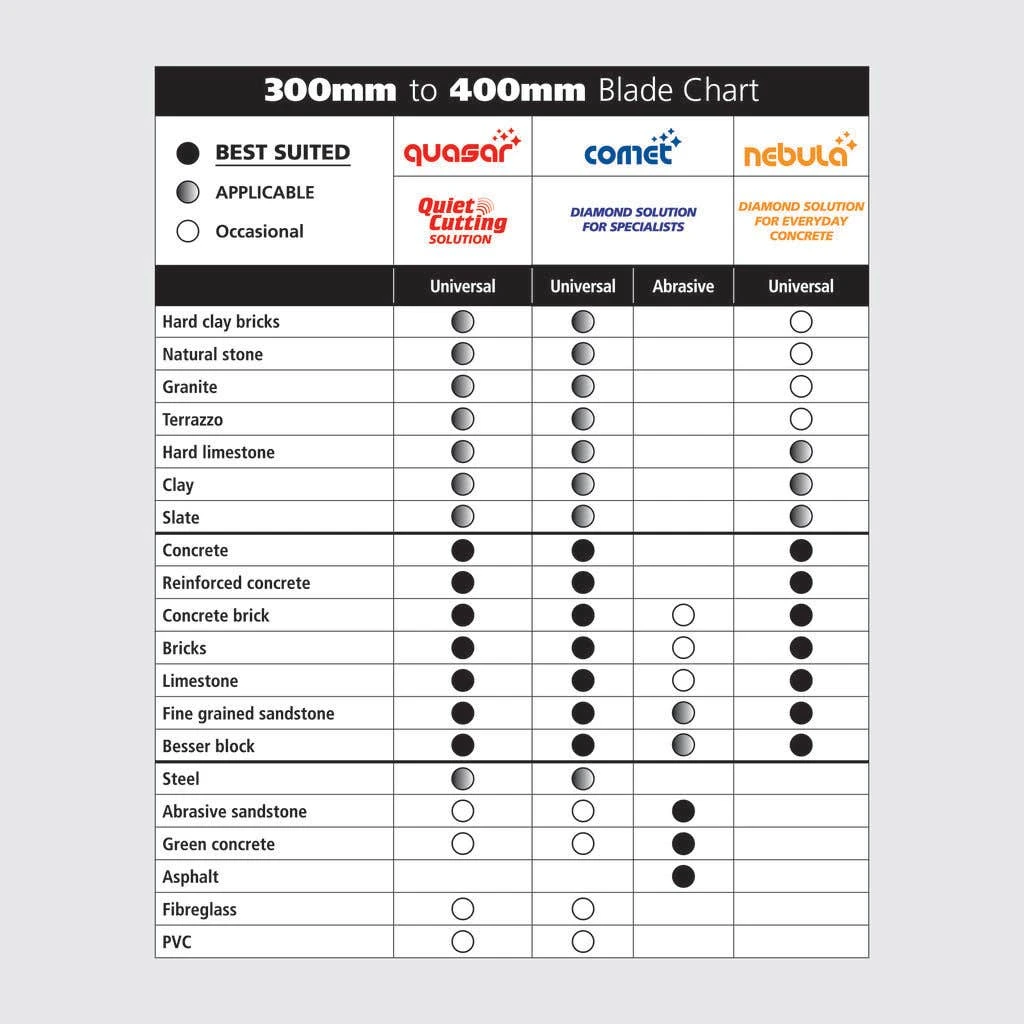 This Comet Segmented Diamond Blade in 115 x 22.23mm is ideal for use in wet and dry cutting, to cut all sorts of concrete, including construction materials. The multi-material blade with its high segment and 2.2mm thickness provides fast and efficient cutting. The included cooling slots help to keep the blade body tempered by eliminating friction build-up and preventing over-heating during use.