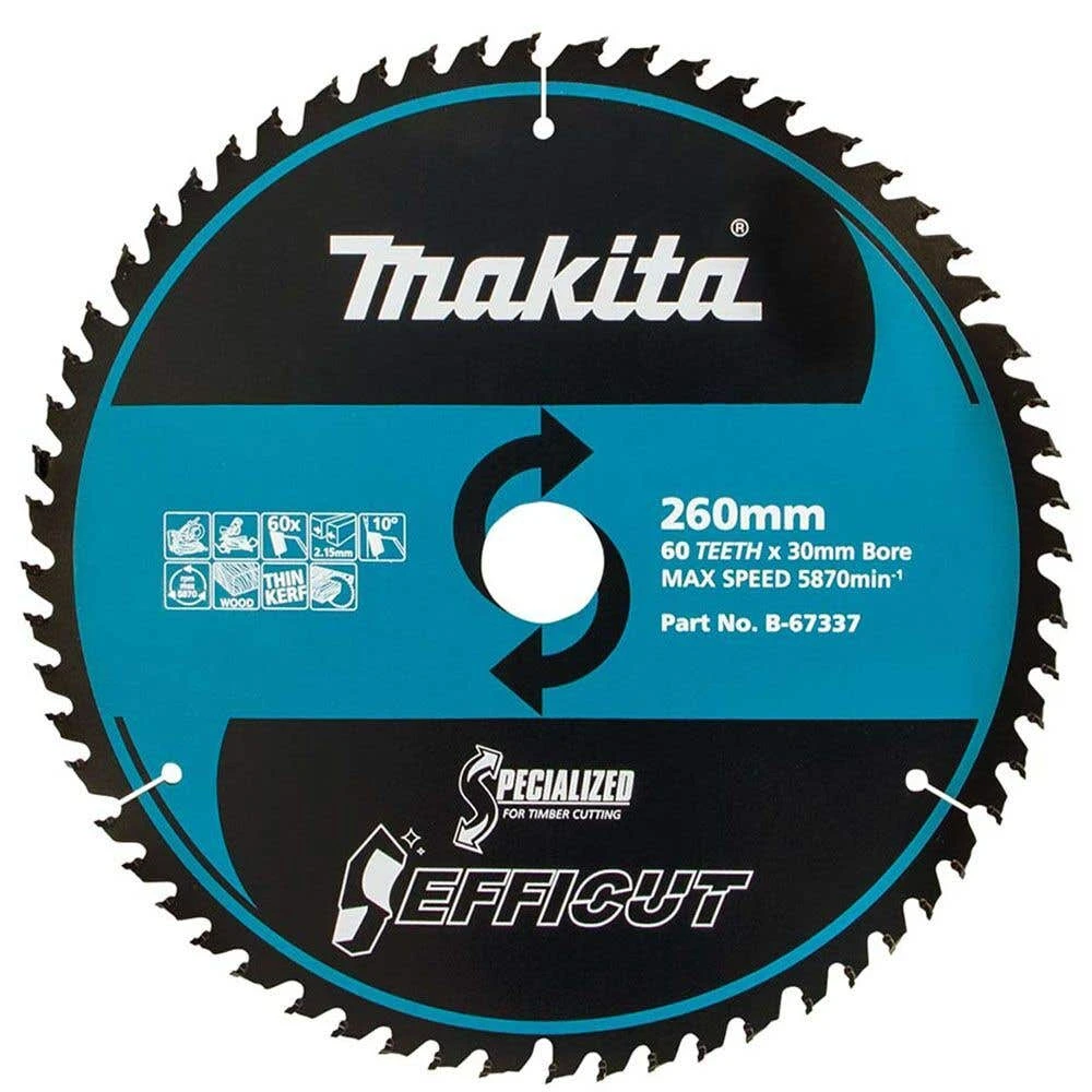 The TCT Efficut Saw Blade is a versatile saw blade that breaks through different materials with ease. The thin kerf makes for less load during cutting and allows for longer runtime. The top bevel angle provides clean cutting with little user effort required. The tooth design helps to provide clean, smooth cuts without splintering on the first cut and reduces chip build-up during drilling, allowing you to use your saws longer without the need to stop and clear. The large blade diameter of 260 mm will enable you to make significant cuts quickly around the workshop, while the blade hook angle of 10° translates into comfortable, low-fatigue sawing.