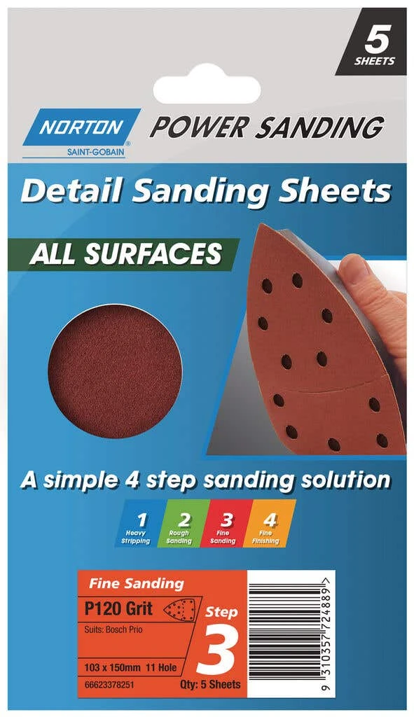 The Norton All Surface Detail Iron Shape Hook & Loop Sanding Sheets provide you with a simple 4 step solution to complete your project. Step 1 for heavy stripping, Step 2 for rough sanding, Step 3 for fine sanding and Step 4 for fine finishing. They are suitable for all surfaces and come in a handy pack quantity of 5.