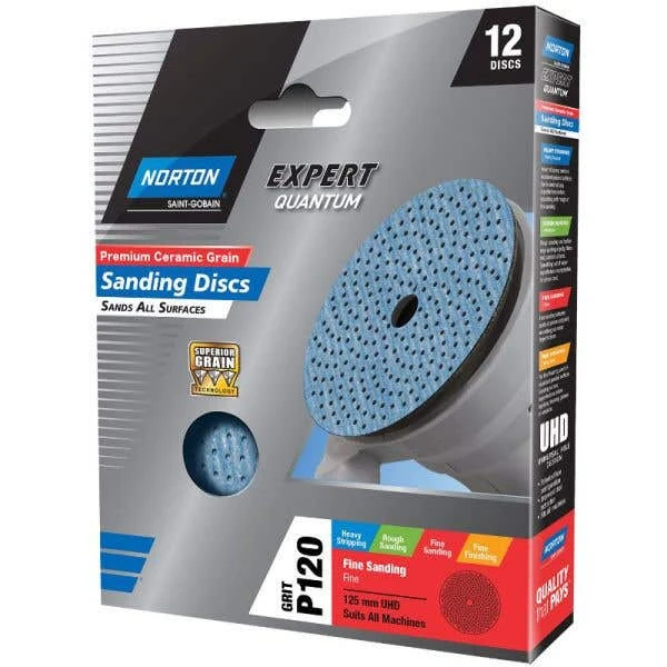 These expert quantum sanding discs are suitable for use with all random orbit palm, dual action and orbital sanders. Elevate your craftsmanship and achieve professional-grade results with the Norton Sanding Disc. Its durability, efficient material removal, precise sanding action, and versatility make it an indispensable tool for artisans and tradespeople alike.