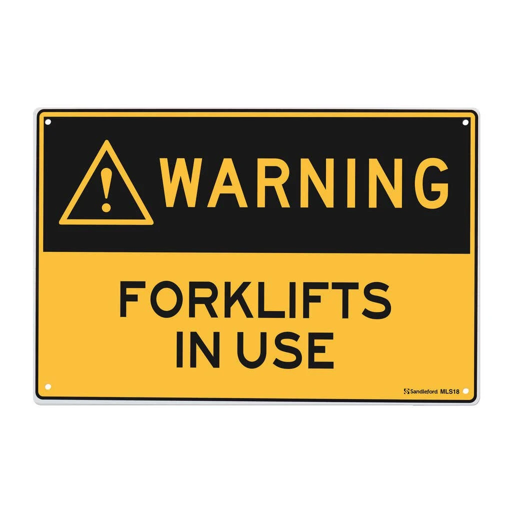 - A vibrant yellow background with bold black text and forklift symbols, ensures it grabs attention and communicates the warning clearly