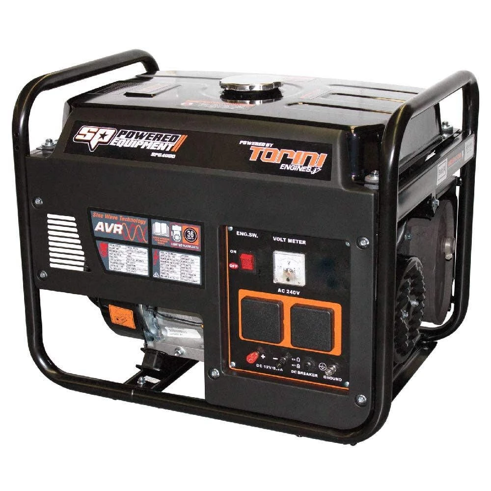 The SP Powered 4KVA Pure Sine Wave is the ideal power solution for your home, office, or construction site. This model delivers smooth, clean power via a Sine wave output that provides a steady flow of electricity. Thanks to the Torino 4-Stroke engine, this offers stable power at low RPMs for preserving fuel efficiency. A large volume muffler reduces internal noise by 50%, and recoil starts grip for easy pull starts. Operated by a Torini 4-stroke engine with an 18-litre fuel tank, the provides reliable power for 17 hours at 50% load. This generator offers the highest surge output in its class, with 7HP peak power and 4kVA continuous and 3100W max power (per phase).