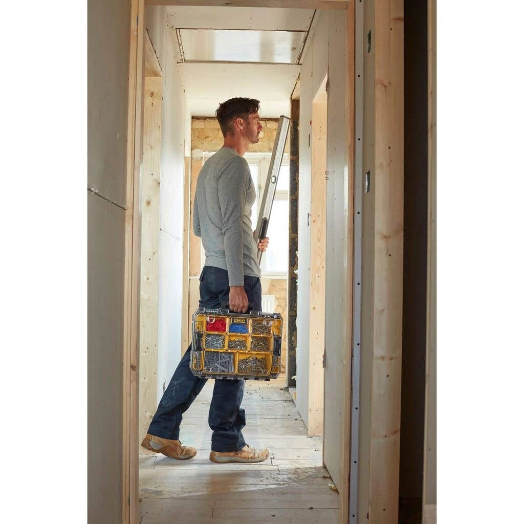 With a total of 10 sorting inserts in different sizes, the Organizer FMST82967-1 is versatile for small parts, accessories and longer tools. Thanks to the transparent, impact-resistant polycarbonate lid you can always keep an eye on the contents of the organiser. The clever lid design prevents sorting inserts from slipping. So the content stays where you sorted it. Robust and rust-proof metal hinges, an ergonomic carrying handle and compatibility with the Pro-Stack system are further important details.