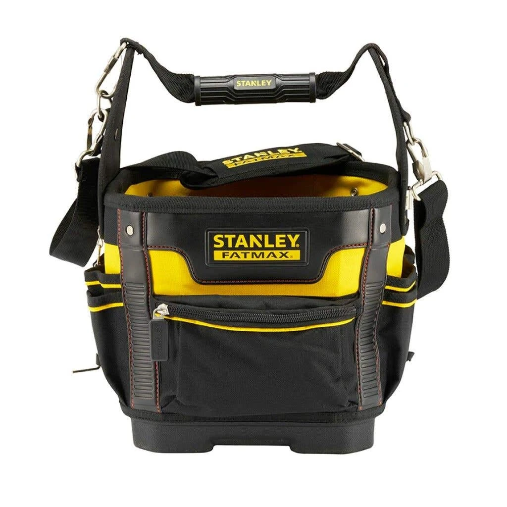 The FatMax Technicians Bag is a smart, job-specific solution for maximum organization. It is made from heavy-duty 600 denier fabric and leather reinforcements for long-lasting durability, to help you get the job done efficiently. With a host of storage solutions perfect for holding everyday tools, it has a removable divider with a belt clip for frequently used tools and equipment and internal pockets for all your small items. The shoulder strap β allows the easier carrying of heavy loads and the steel holder for electrical tape & tape measure adds functionality so everything is close to hand.