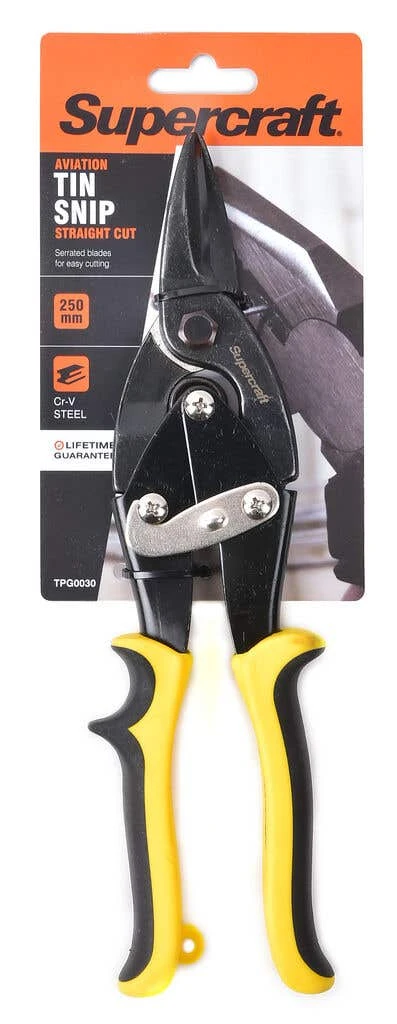 Aviation Tin Snips are professional quality, high-grade chrome vanadium steel jaws. The double link lever mechanism gives greater cutting force with less hand pressure. Ideal for cutting sheet metal, ducting, and plumbing in rough conditions. Handles are fitted with a soft grip for comfortable use.