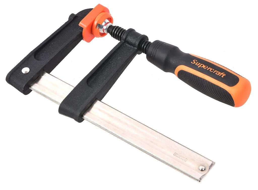 This clamp has a swivel shoe with a protective cap, which makes it easy to tighten and release the clamp. It is used in woodworking and metalworking while more permanent attachment is being made with screws or glue.