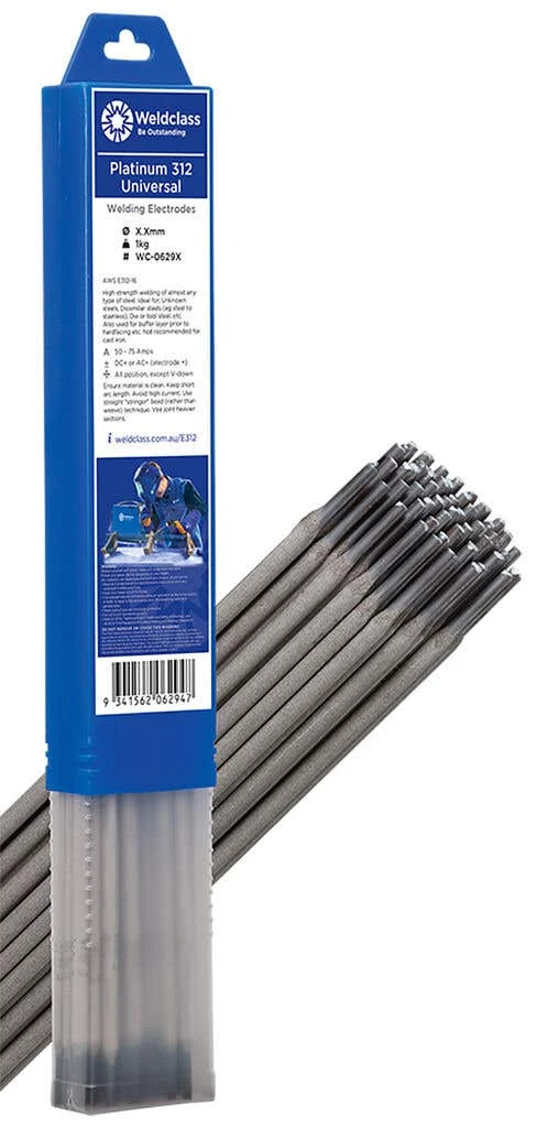This 312 Universal series weld-all style electrodes (welding rods) are suitable for high-strength and crack-resistant welding of almost any steel or stainless steel, including dissimilar metals. Some key features of this weld metal are its strength and crack resistance. They can be used all positional, except vertical-down. Easy to use and suitable for low OCV (open circuit voltage) welding machines (>45V). This type of welding rod has a smooth arc, low spatter, excellent slag control/detachability and high-quality weld appearance.