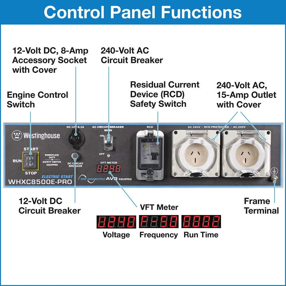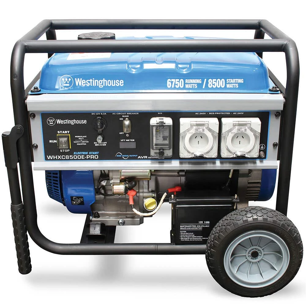 The Westinghouse WHXC8500E-Pro is a portable with a powerful 420cc Westinghouse 4-stroke OHV petrol engine and pushes 8,500 starting watts/6,750 running watts of power. This great is Australian WH&S approved and comes equipped with RCD safety switch and 13.1 hours run time at 50% output with 25L tank.